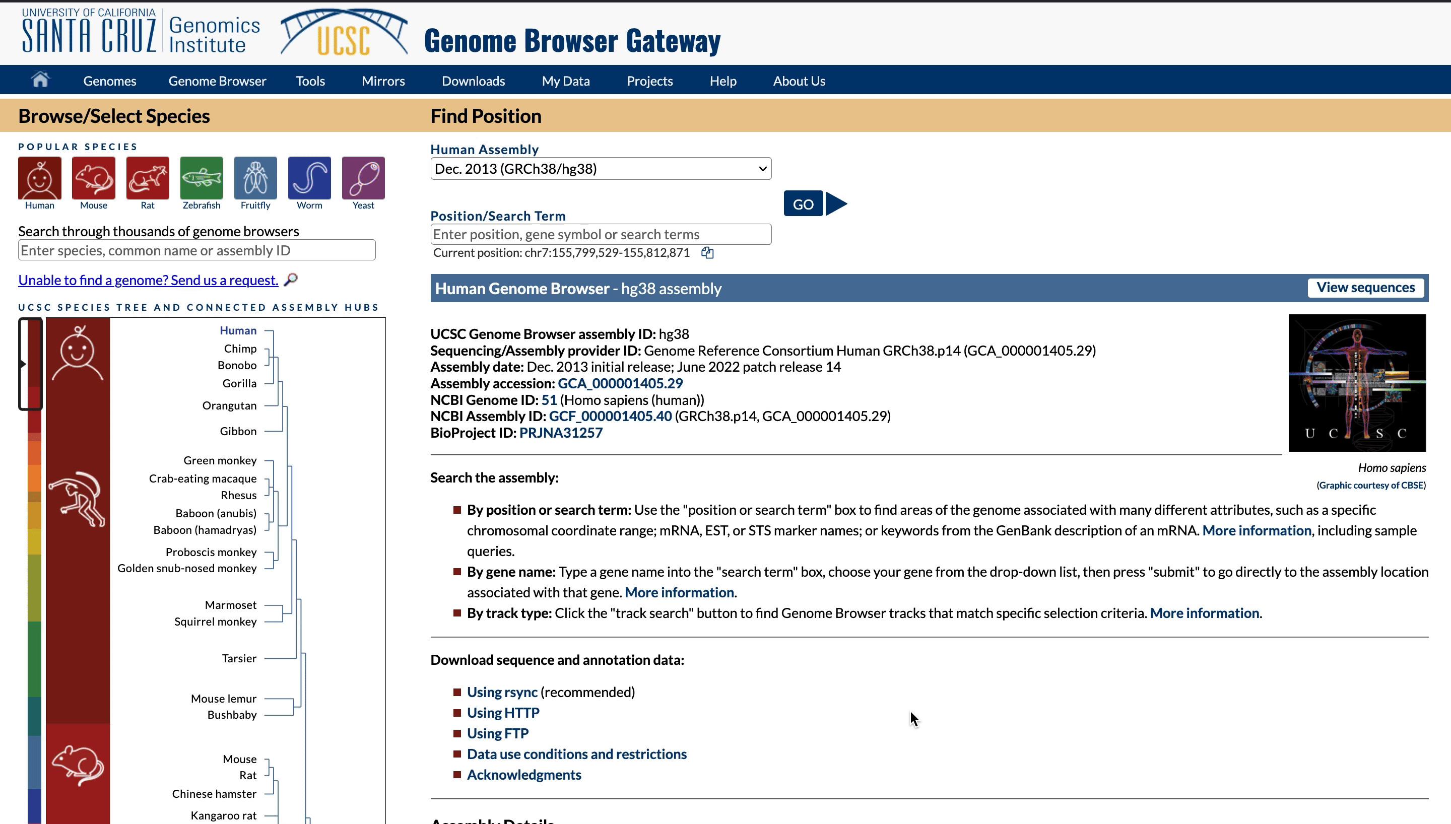 The UCSC Genome Browser Gateway page is a tool for finding and accessing genome assemblies. It features two search boxes: one for selecting an assembly and another for specifying a genomic position. This tutorial will guide you through various features of the Gateway page, including: