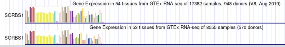 GTEx is a database that has five tracks on the Genome Browser that can be used to visualize tissue-specific isoform expression. Found in the "Expression" section are the tracks "GTEx Gene V8", "GTEx Gene", and "GTEx Transcript". The two former tracks both average gene expression in cell types from all of the gene's isoforms, shown in Figure 2 ("V8" has an additional tissue type). However, "GTEx Transcript" shows cell-type gene expression for each individual isoform. Since the "GTEx Transcript" track isolates splice variant expression, let's choose two isoforms from SORBS1 and compare their tissue-specific gene expression.