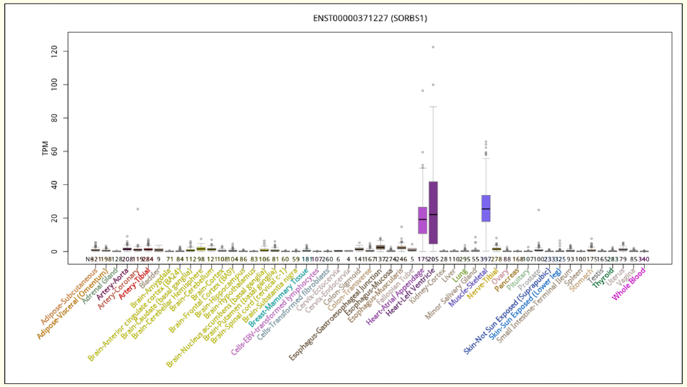 Figure 3a shows a custom track which isolates two isoforms of SORBS1, ENST00000371227.8_1 (dubbed ENST227 from this point for convenience) and ENST00000371249.6_1 (dubbed ENST249). ENST227 includes seven exons that ENST249 does not. This is visually clear as ENST249 is missing some exons that are present on ENST227. The mature transcripts encode proteins of 816 and 1266 amino acids respectively. As seen in Figure 3a, below the isoform custom track is the "GTEx Transcript" track, which shows two individual bar charts, for these isoforms, illustrating its expression frequencies in different tissue types. In the close-up, Figure 3b, three exons of one isoform can be seen that are absent from the other.