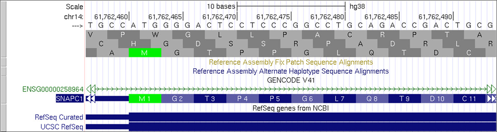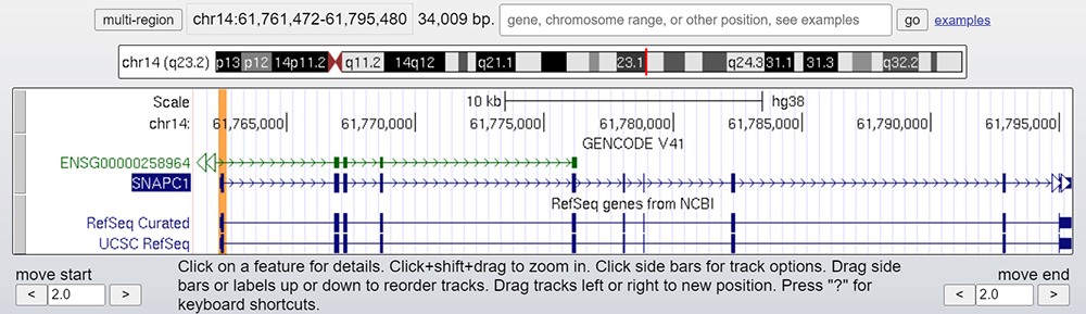 Figure 1. Main page for the SNAPC1 gene on the hg38 Genome Browser. Highlighted in orange is the example exon we will use to explain reading frames.