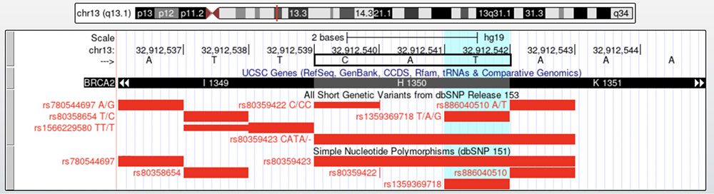 In Figures 1 and 2, the "UCSC Genes" track is displaying exon 11 of the BRCA2 gene. Below the "UCSC Genes" track are two "dbSNP" tracks, "dbSNP153" (upper) and "dbSNP151" (lower); these two tracks are different iterations of the same rsIDs and data, with some differences between the two data releases. The two tracks have different details available when clicking on one track or the other. Checking both versions of the rsID, or "reference SNP" can provide a wide range of insight into a variant.